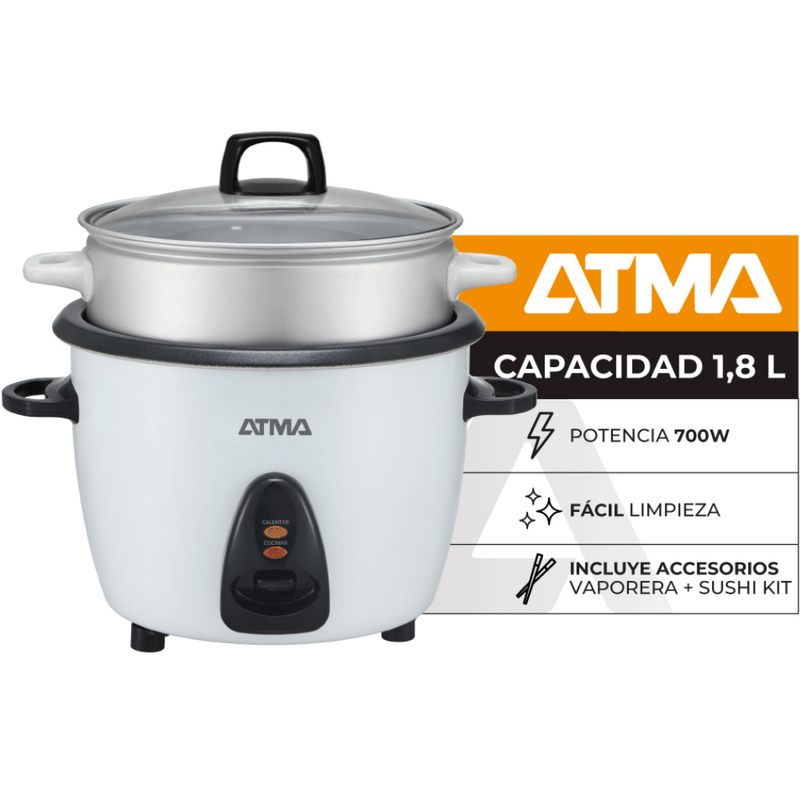 La Arrocera + Vaporera con Kit de Sushi capacidad 1.8 lt Atma es un electrodoméstico de cocina que combina una arrocera y una vaporera en un solo dispositivo. Además, incluye un kit de sushi para cocinar en casa de manera fácil y rápida.