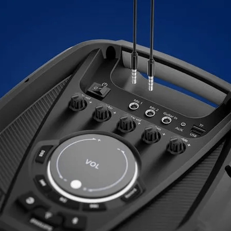 2 x Entrada micrófono (6,3 mm con control de volumen), 1 x Entrada guitarra (6,3 mm con control de volumen)
