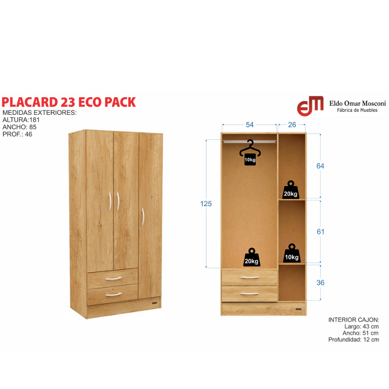MUEBLES COLCHONES Y TEXTILHabitaciónEspecial PlacaresPLACARD E-MOSCONI 3 PUERTAS TONO CHOCOLATE 181x85x46cm 57076