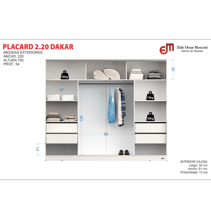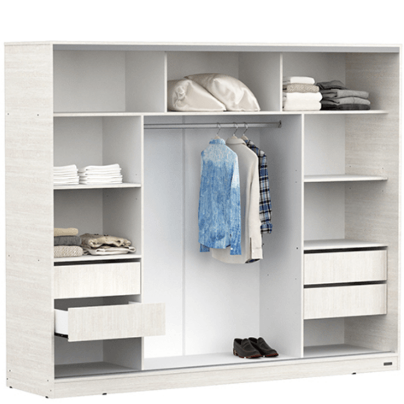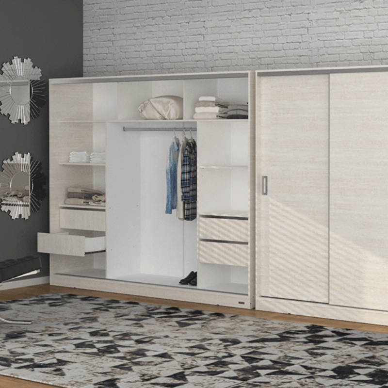 Amplio espacio de guardado Incluye área de colgado con barral de aluminio y cuatro cajones.