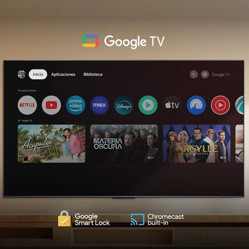 GOOGLE TV: sistema operativo Google en un TV ofrece acceso a una gran variedad de aplicaciones como Netflix, YouTube y Disney+, permite usar el Asistente de Google para buscar contenido con la voz, organiza recomendaciones según lo que mirás, se actualiza automáticamente para mejorar su funcionamiento y facilita la conexión con el celular para transmitir fotos, videos o música.