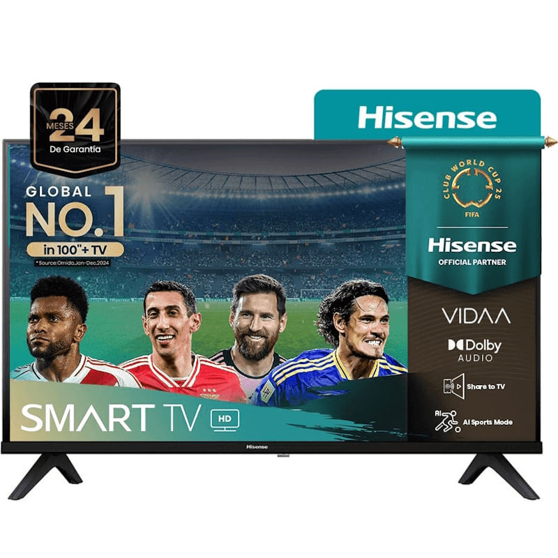 Este modelo Hisense 32A42K es de color negro y funciona con el sistema operativo Vidaa. Es un televisor inteligente (Smart TV) y tiene dos parlantes para el sonido, ofreciendo una experiencia audiovisual completa.