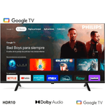 GOOGLE TV: sistema operativo Google en un TV ofrece acceso a una gran variedad de aplicaciones como Netflix, YouTube y Disney+, permite usar el Asistente de Google para buscar contenido con la voz, organiza recomendaciones según lo que mirás, se actualiza automáticamente para mejorar su funcionamiento y facilita la conexión con el celular para transmitir fotos, videos o música.