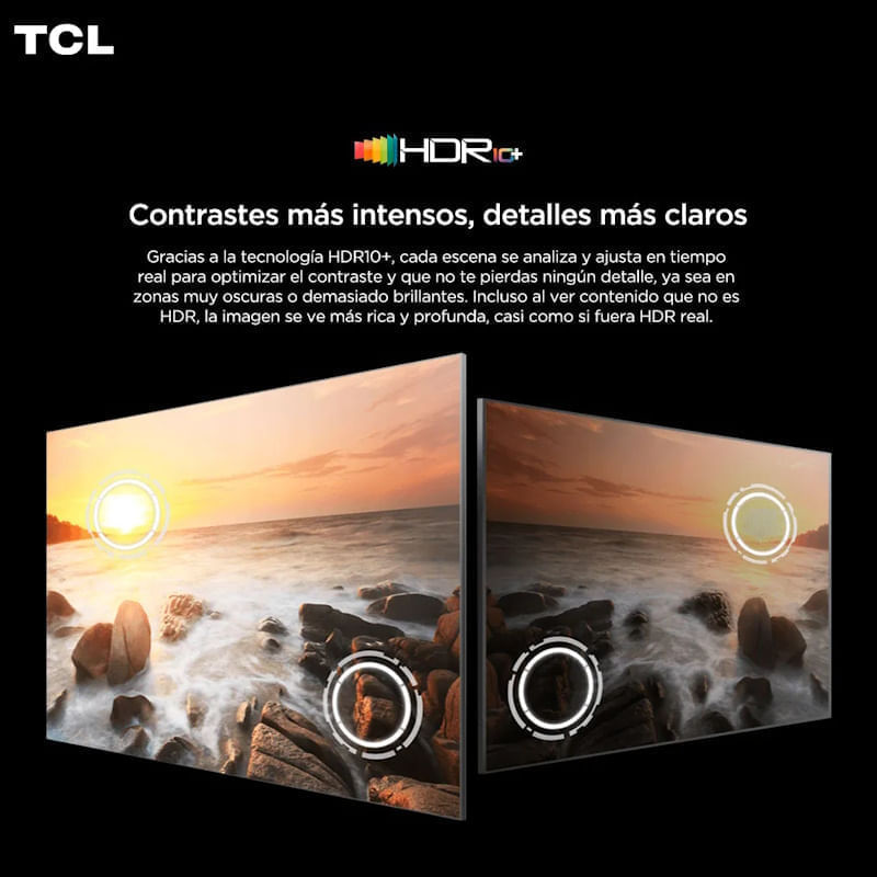 HDR10+: Ajuste dinámico de contraste y brillo. Negros profundos y detalles claros en cada escena.